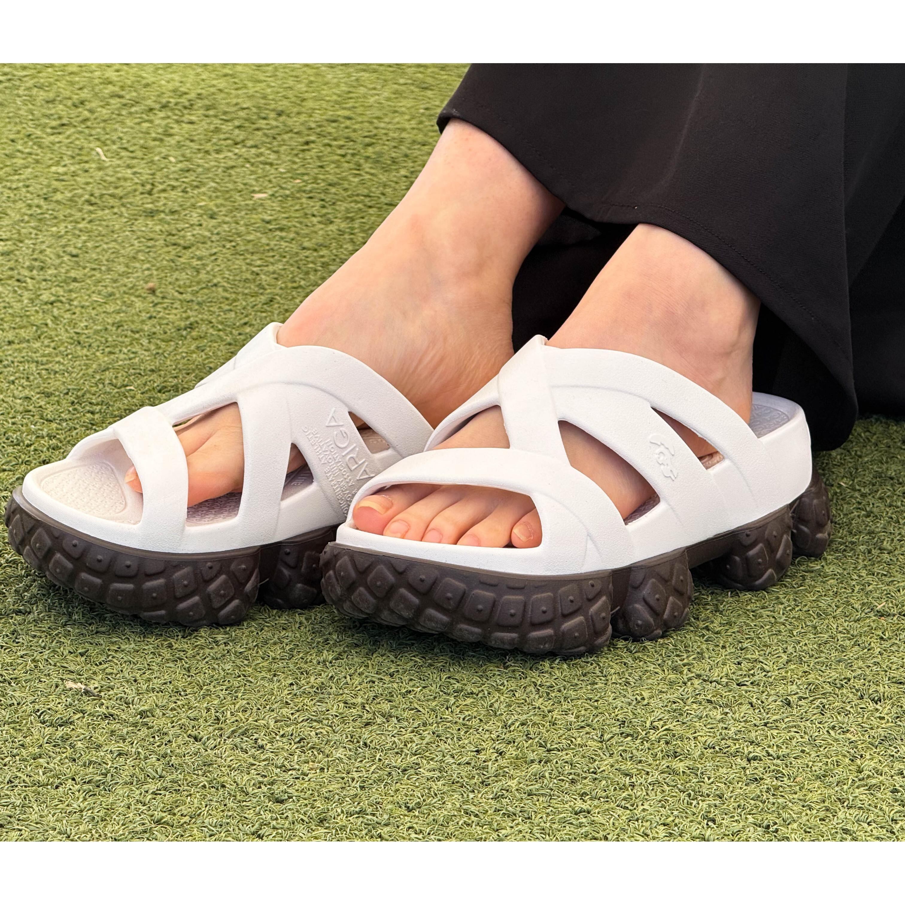 クロスしたストラップが足を包み込み、快適なフィット感を提供します。