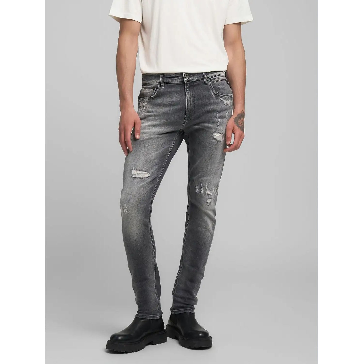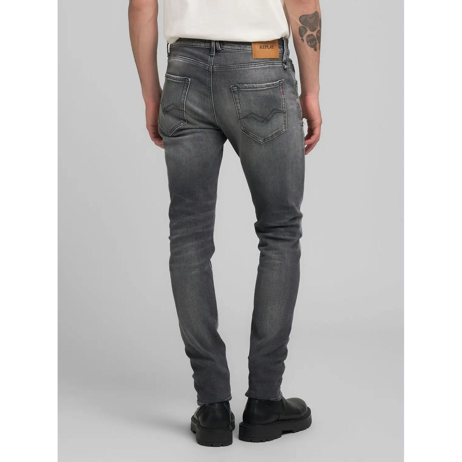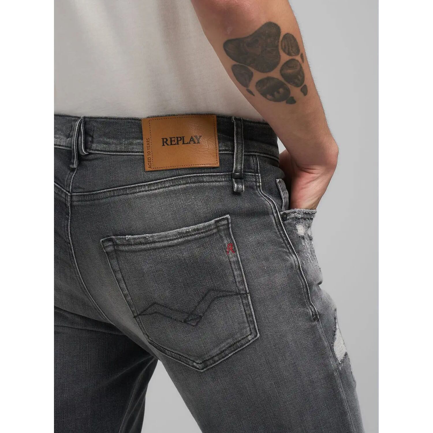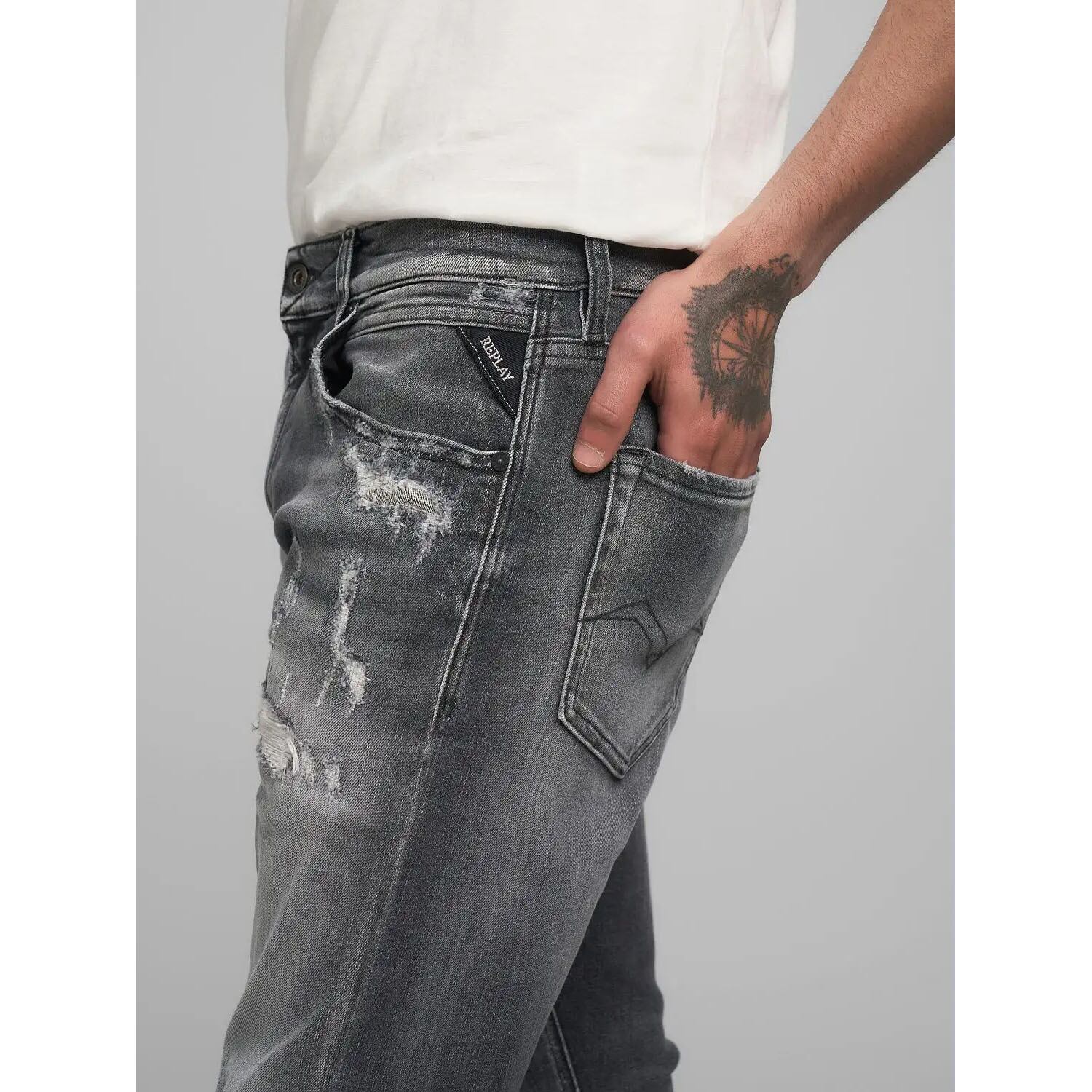 5ポケットのこのジーンズは、手作業によるウィスカー加工とスクレーピング、そして脚の部分に施された手作業による補修跡、そして擦り切れた部分には色のコントラストが加えられ、Replayならではのスタイルを体現しています。