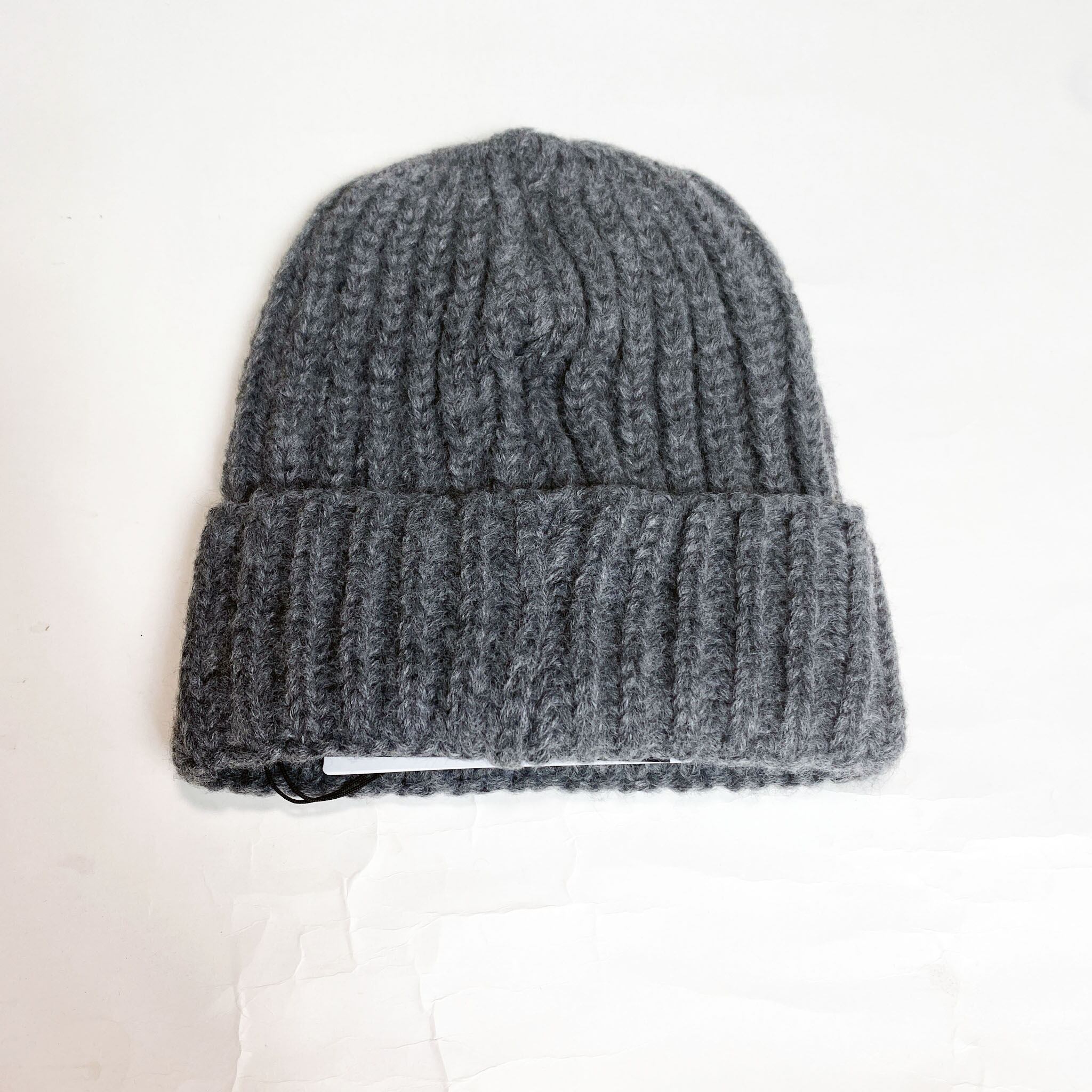 起毛糸を使用し、緯糸をオープンにしたリブ編みのビーニー。