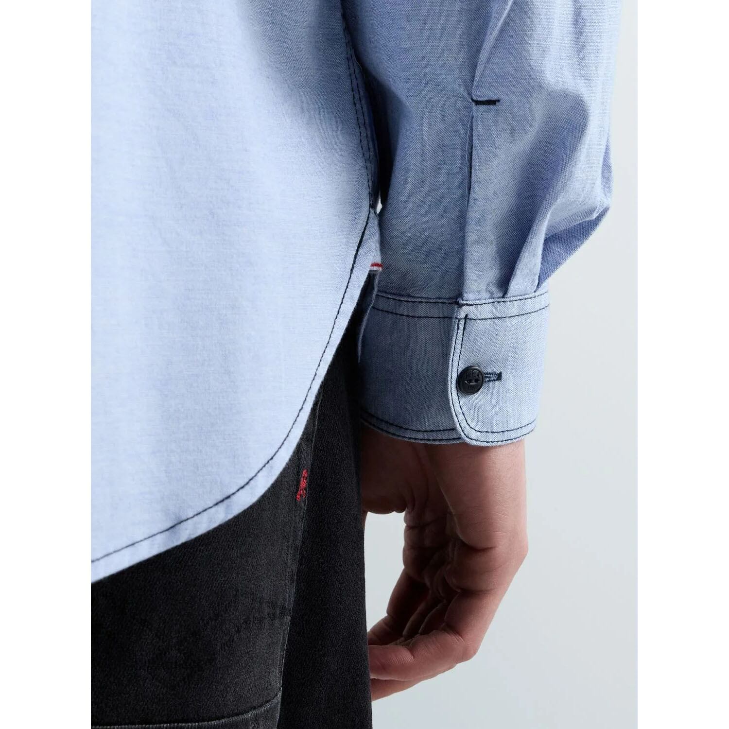 涼しげなオックスフォードコットンを使用した、リラックスフィットのシャツ。フロントボタン留めに加え、袖口と胸ポケットにもボタンがあしらわれ、コントラストの効いたステッチでトリミングされています。片方のポケットには赤い「R」の刺繍、サイドスリットの入ったラウンドヘム、そして背面のヨークにはダブルプリーツが施されています。
