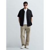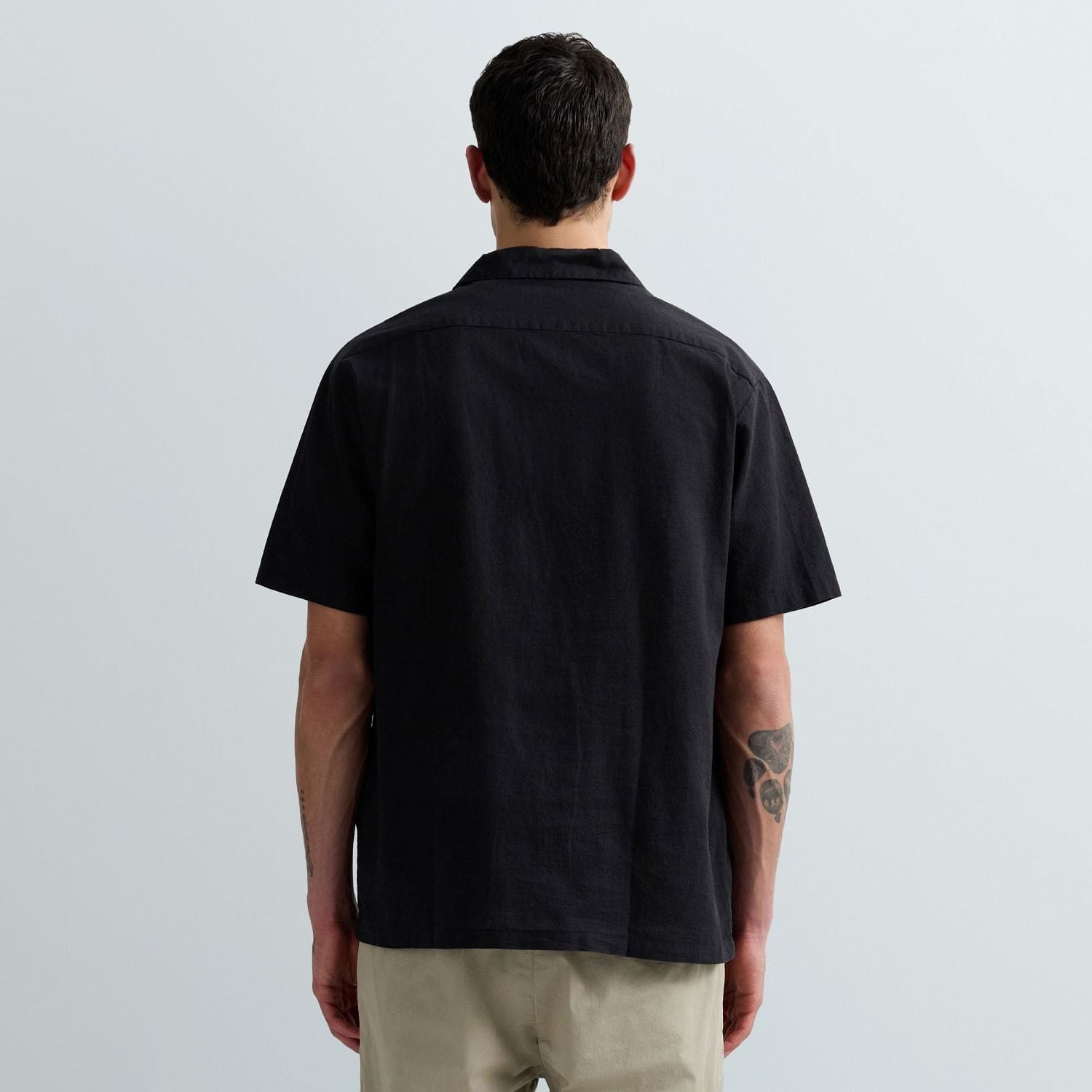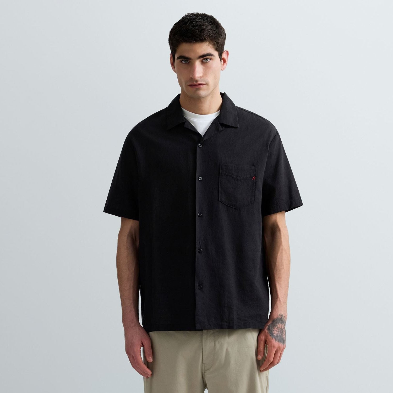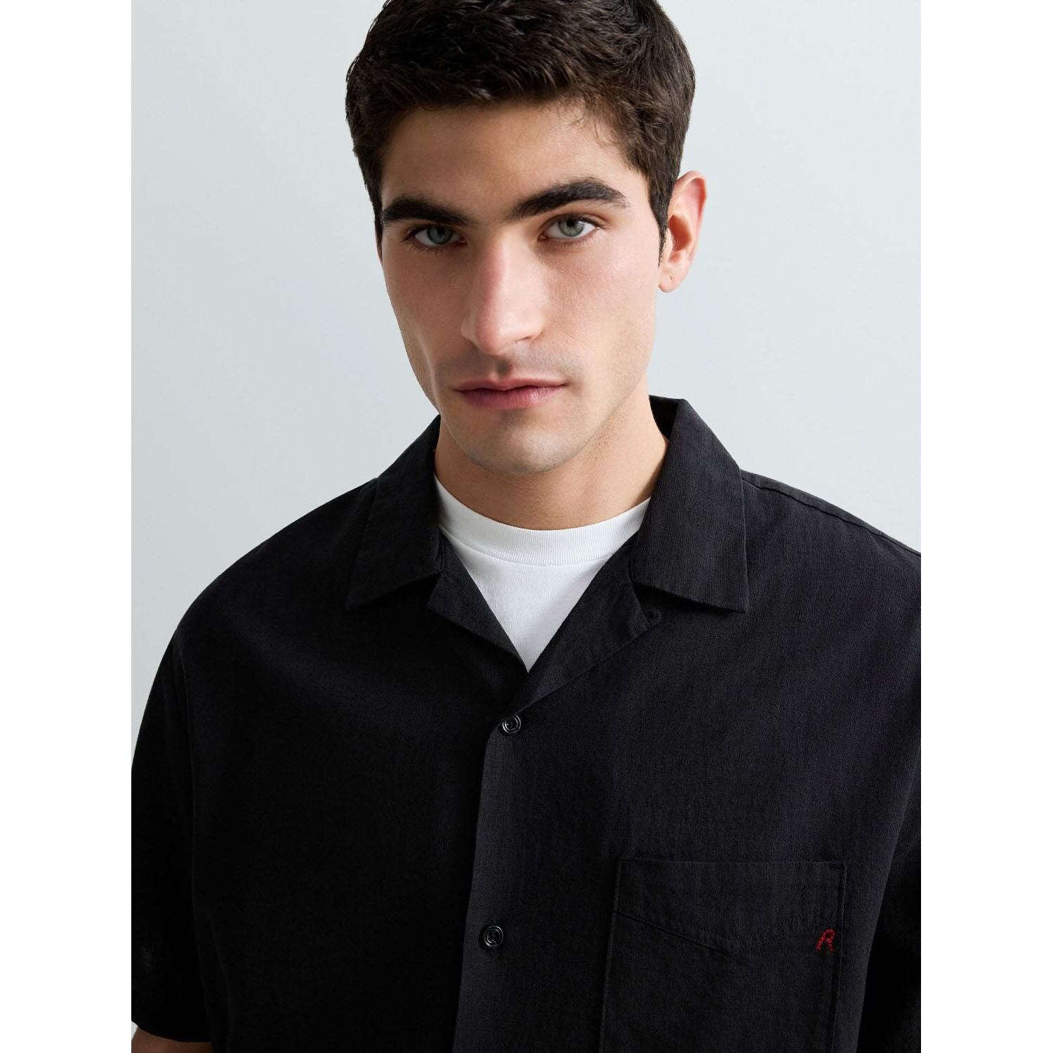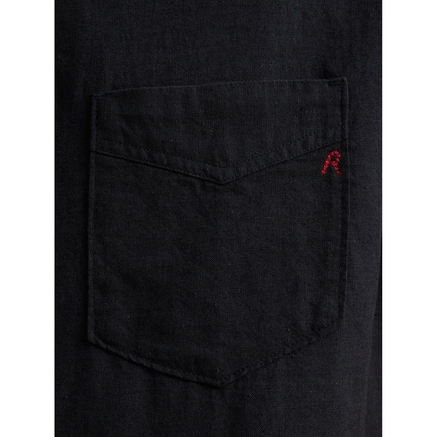 涼しげなコットンとリネンの混紡素材を使用した、ゆったりとしたシルエットのシャツ。半袖で、ラペルカラー、幾何学模様の胸ポケット、前立てボタンが特徴です。さらに、バックヨークと、胸ポケットにあしらわれたReplayの象徴的な赤い「R」の刺繍がアクセントになっています。