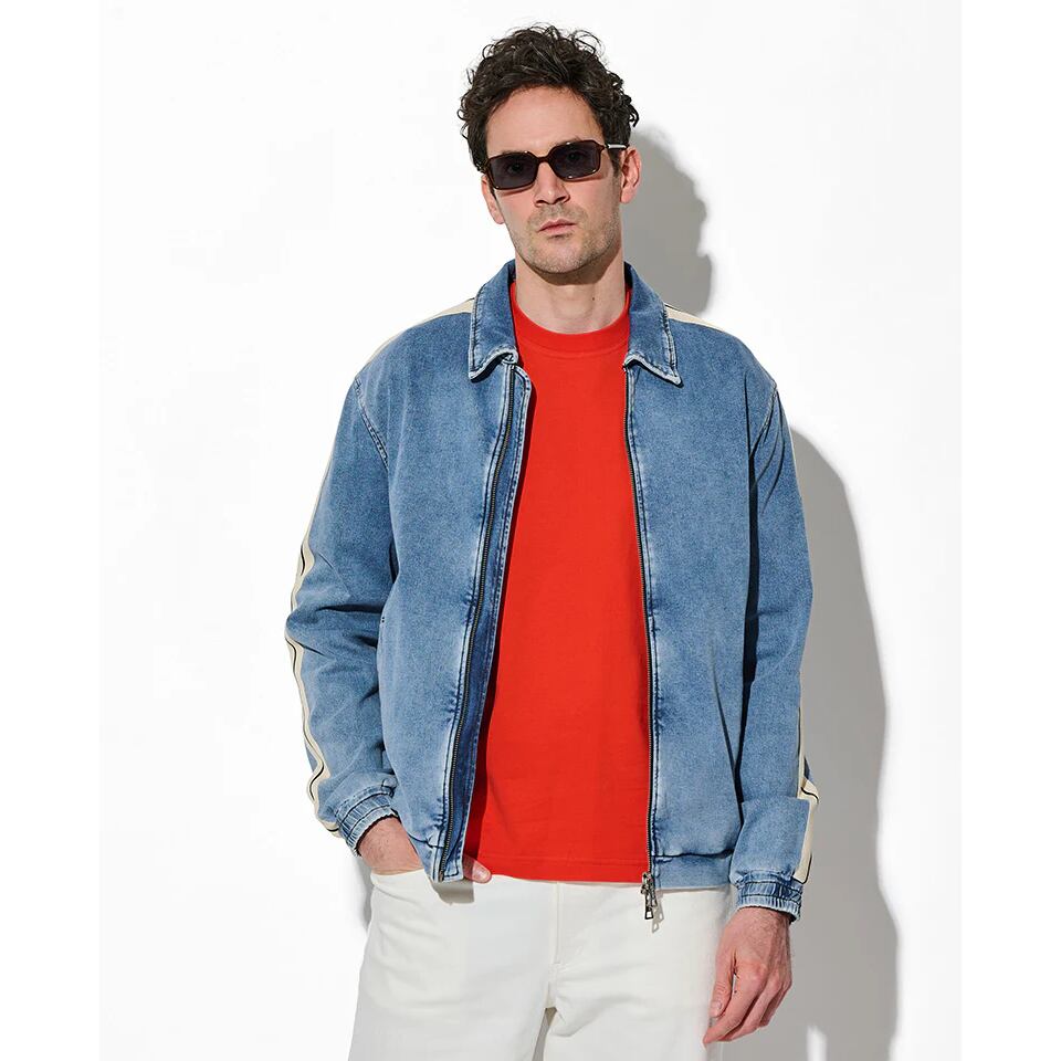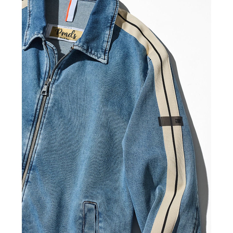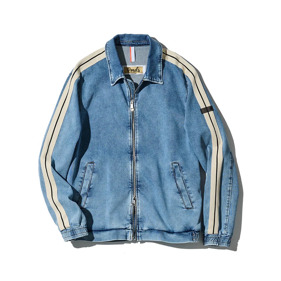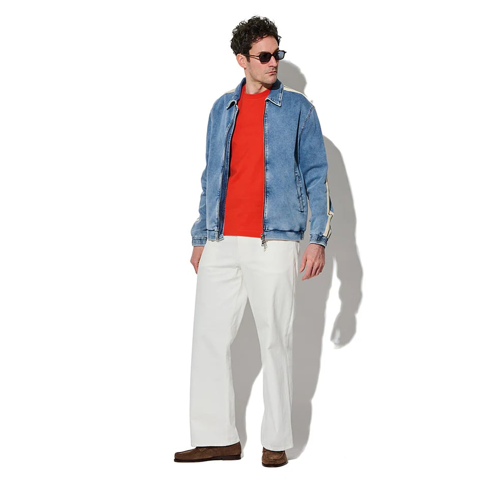 ココンチらしいスポーティな感性をデニムとスウェットを掛け合わせた独自のデニット素材で表現。ほどよく色落ちしたブルーデニムの表情が、こなれ感と大人のカジュアルさを演出します。そして袖にはコントラストの効いたサイドラインを配し、シンプルなデザインのなかにシャープなアクセントをプラス。。
