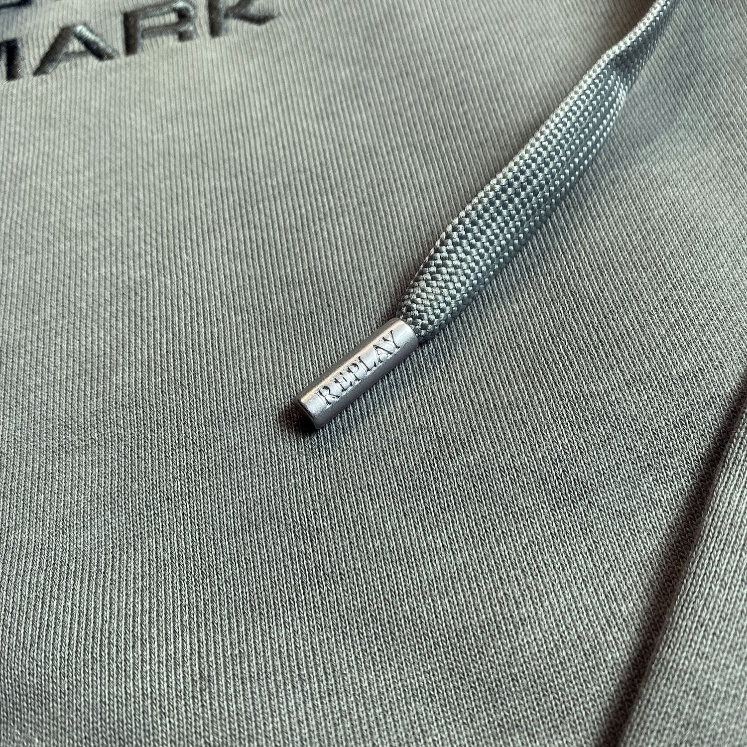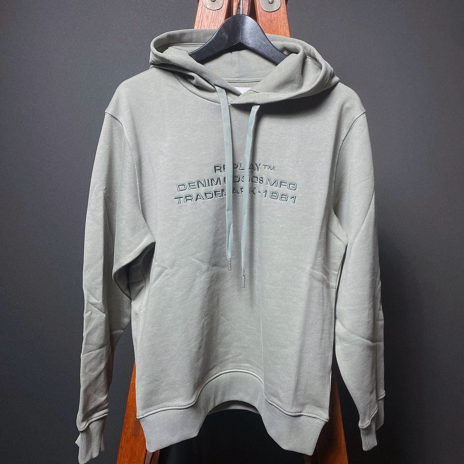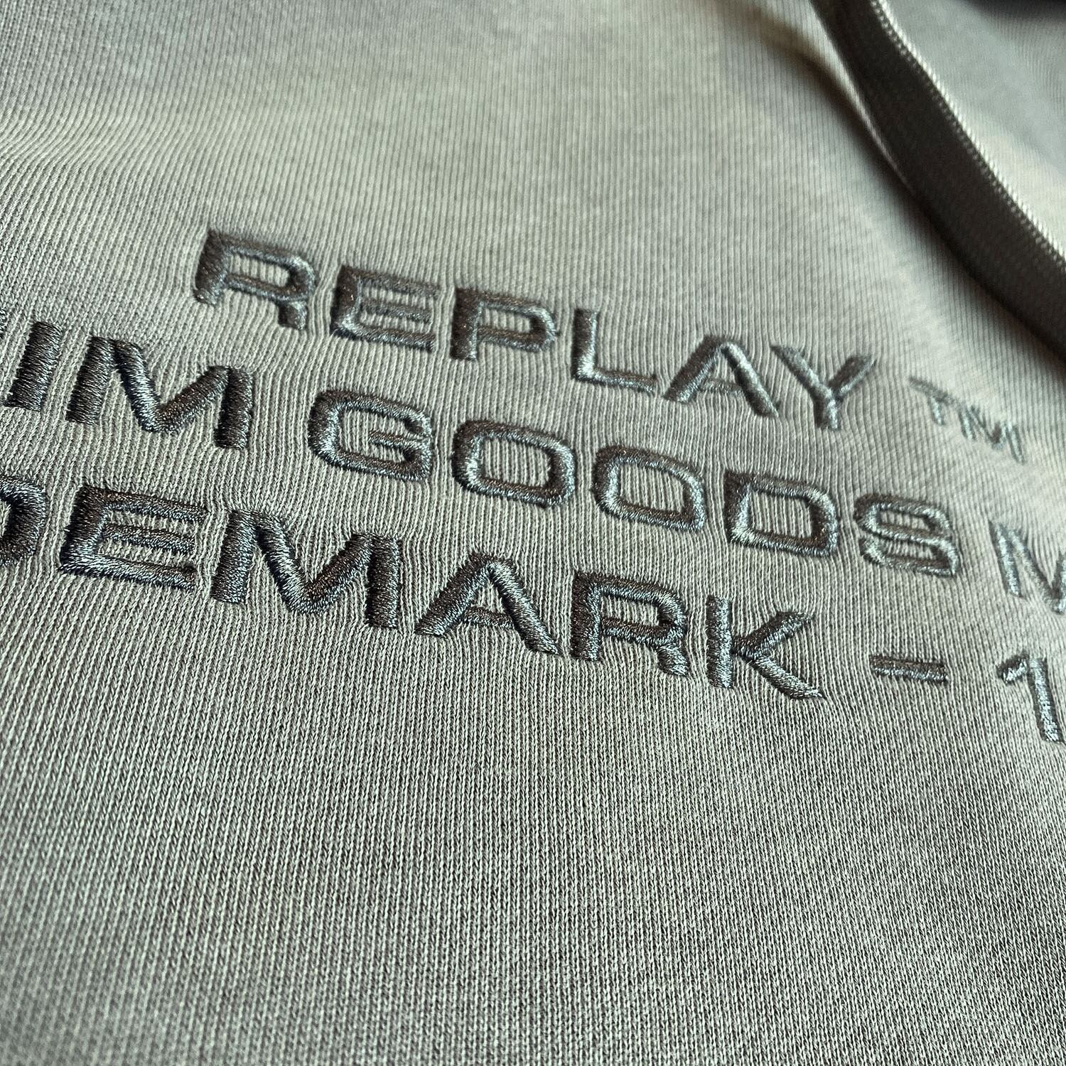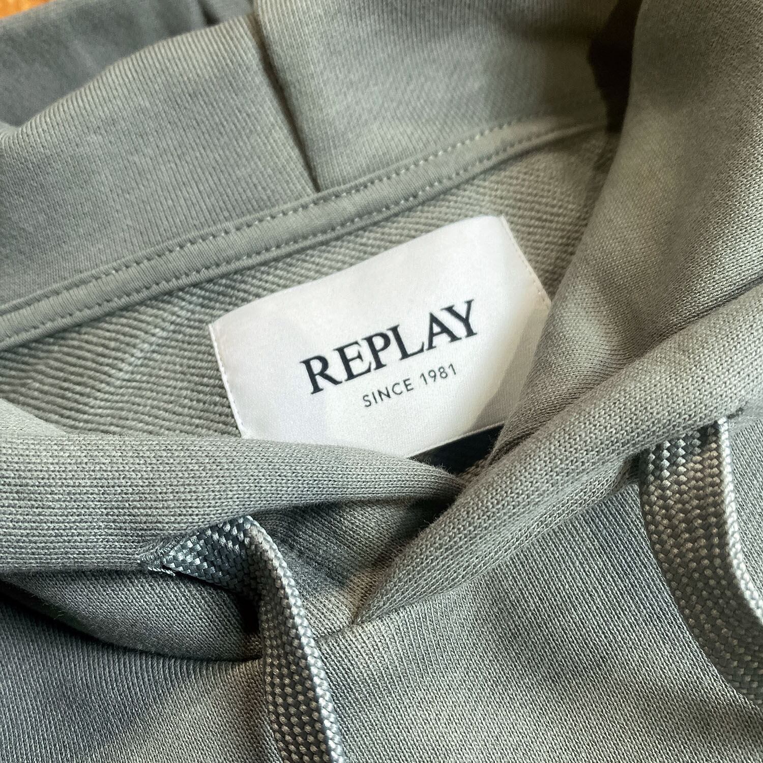 落ち着いた色味に、フロントの立体感あるロゴ刺繍がさりげなく映えるREPLAYのプルオーバーパーカー。