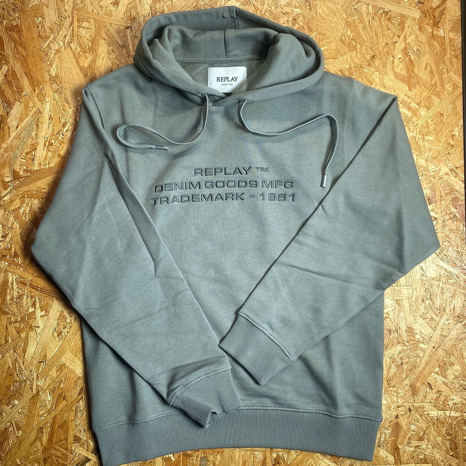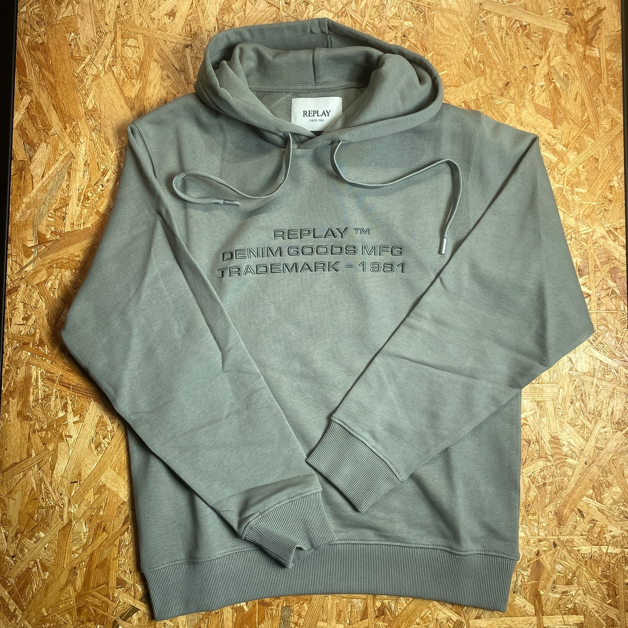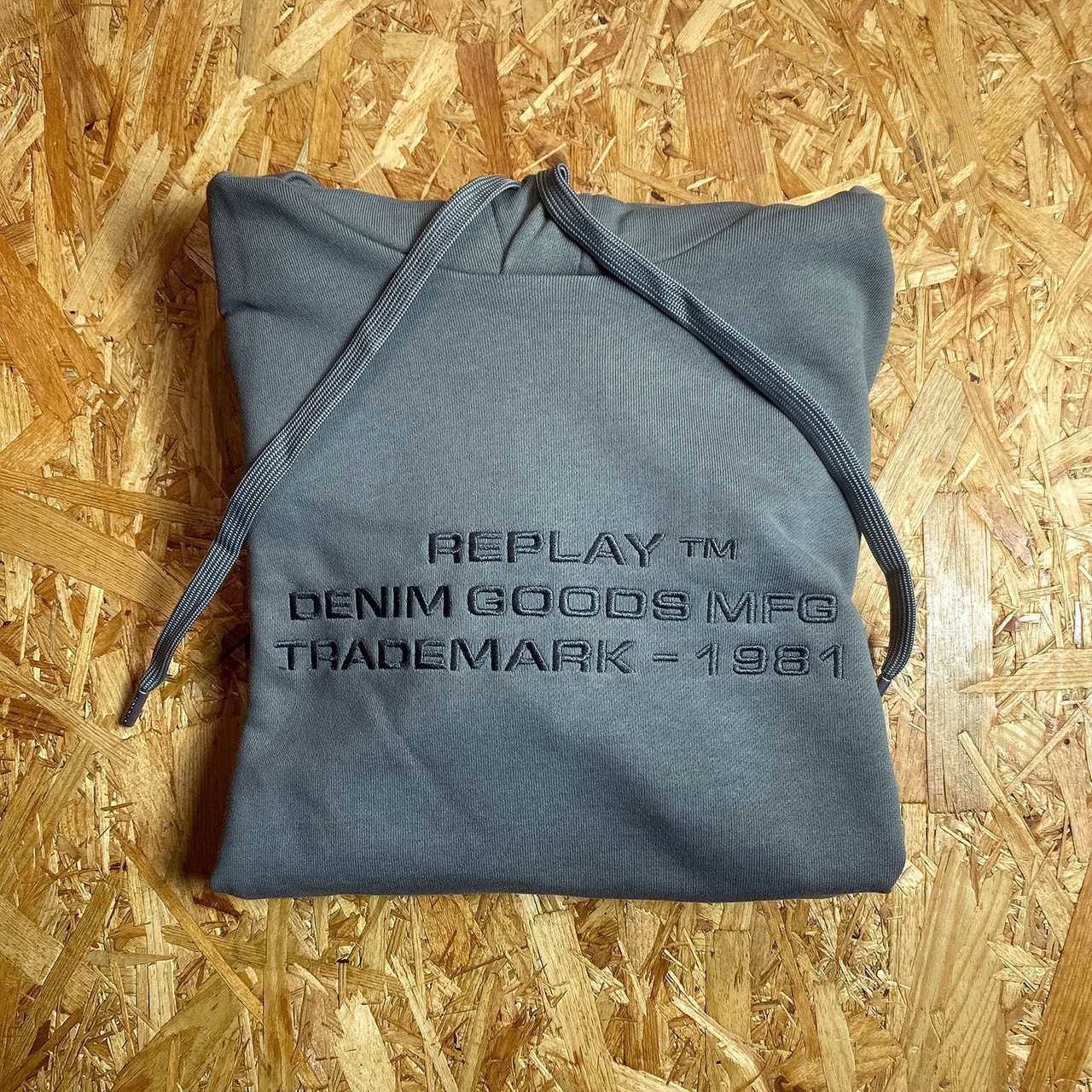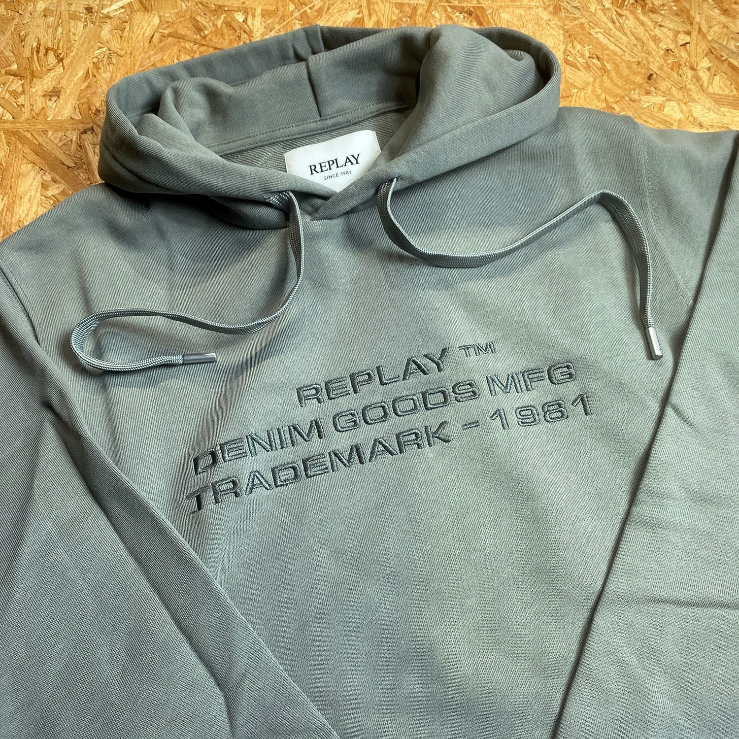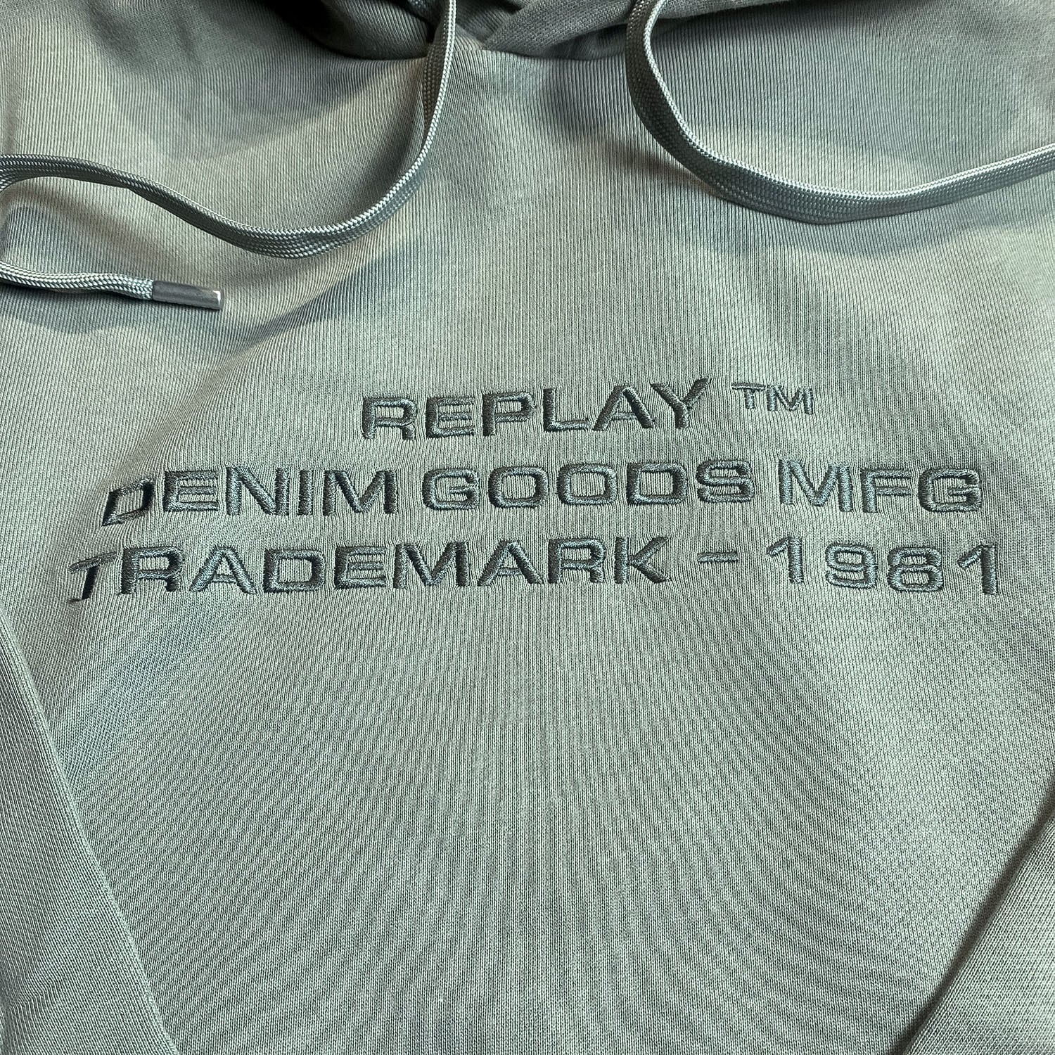 落ち着いた色味に、フロントの立体感あるロゴ刺繍がさりげなく映えるREPLAYのプルオーバーパーカー。