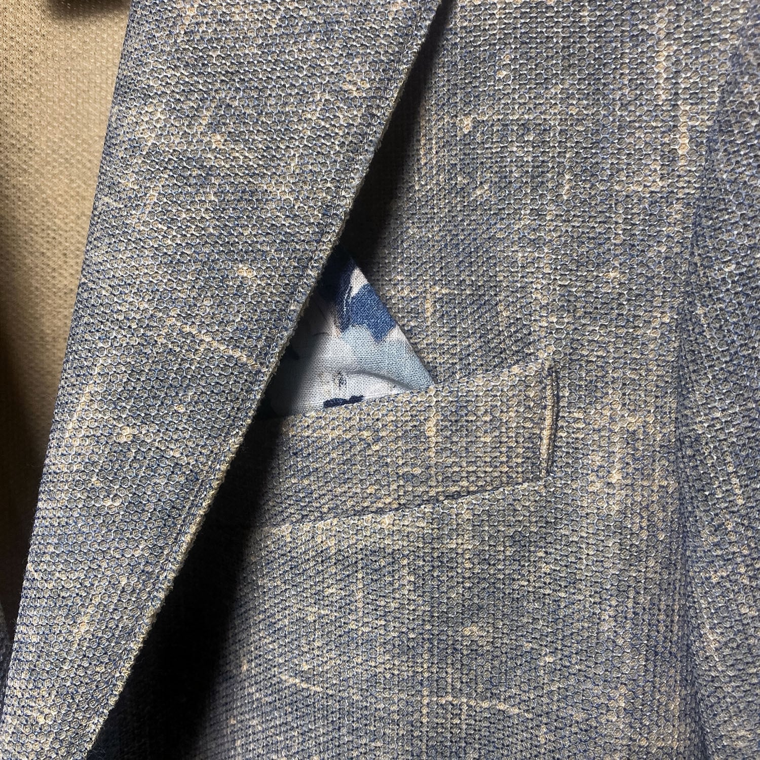 淡いブルーをベースに、織りで表現された柄感がさりげなく奥行きをつくり、無地にはない洒落感を演出。主張が強すぎないので合わせやすく、普段のコーディネートにも自然に取り入れやすい一着です。