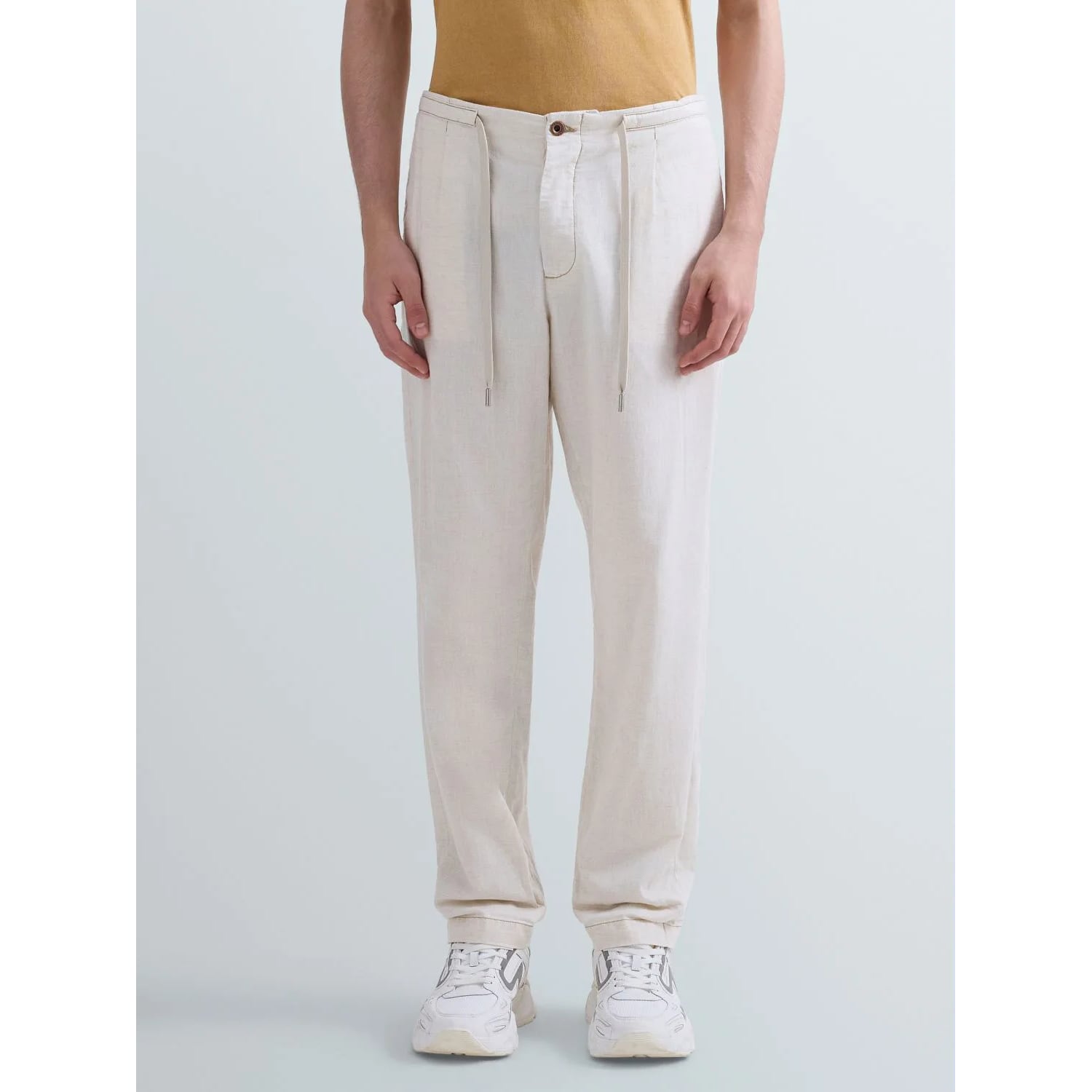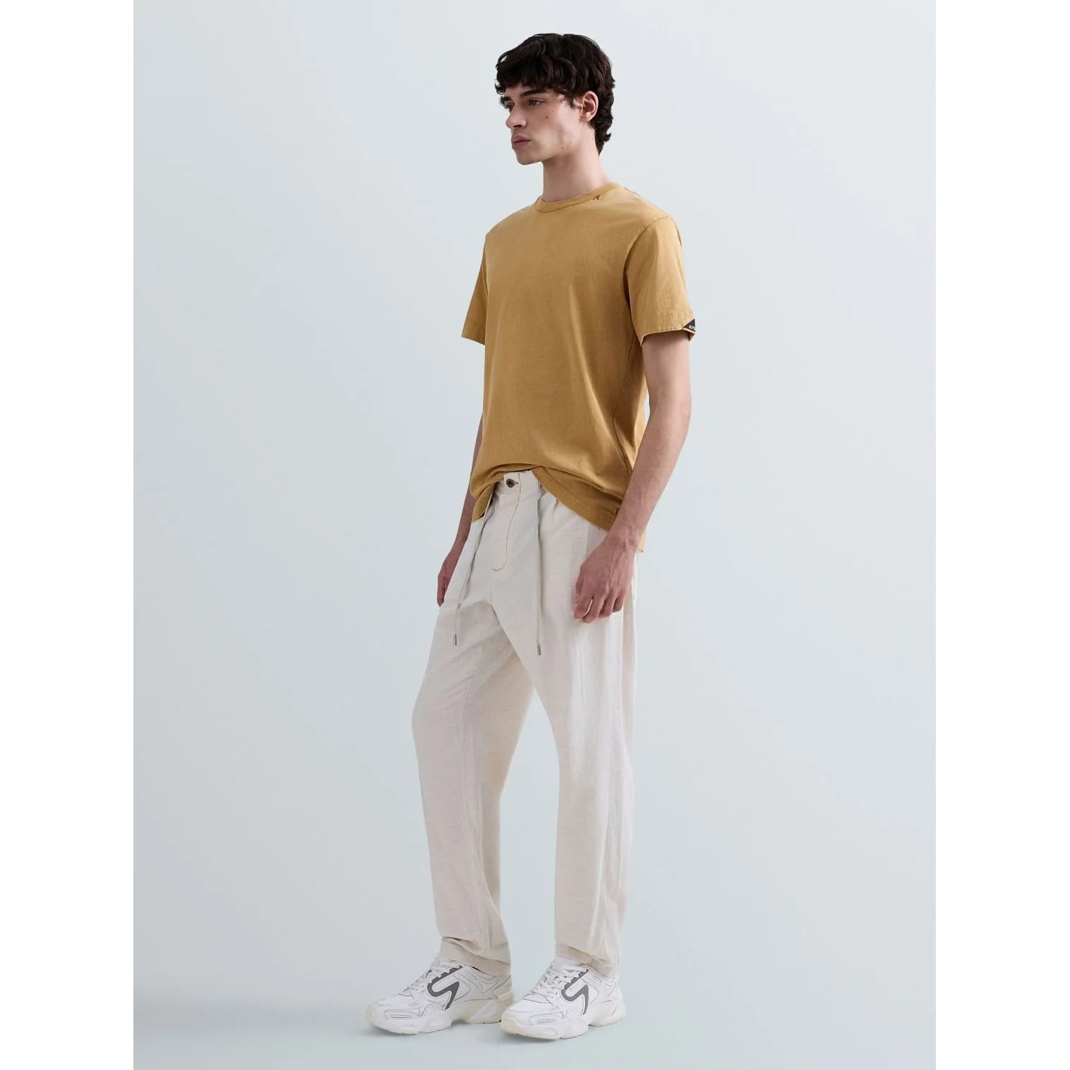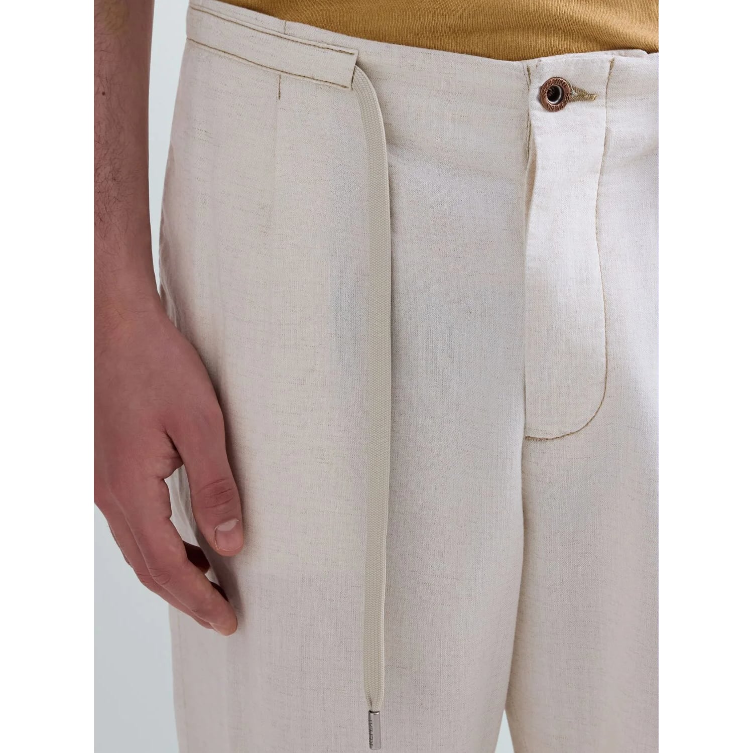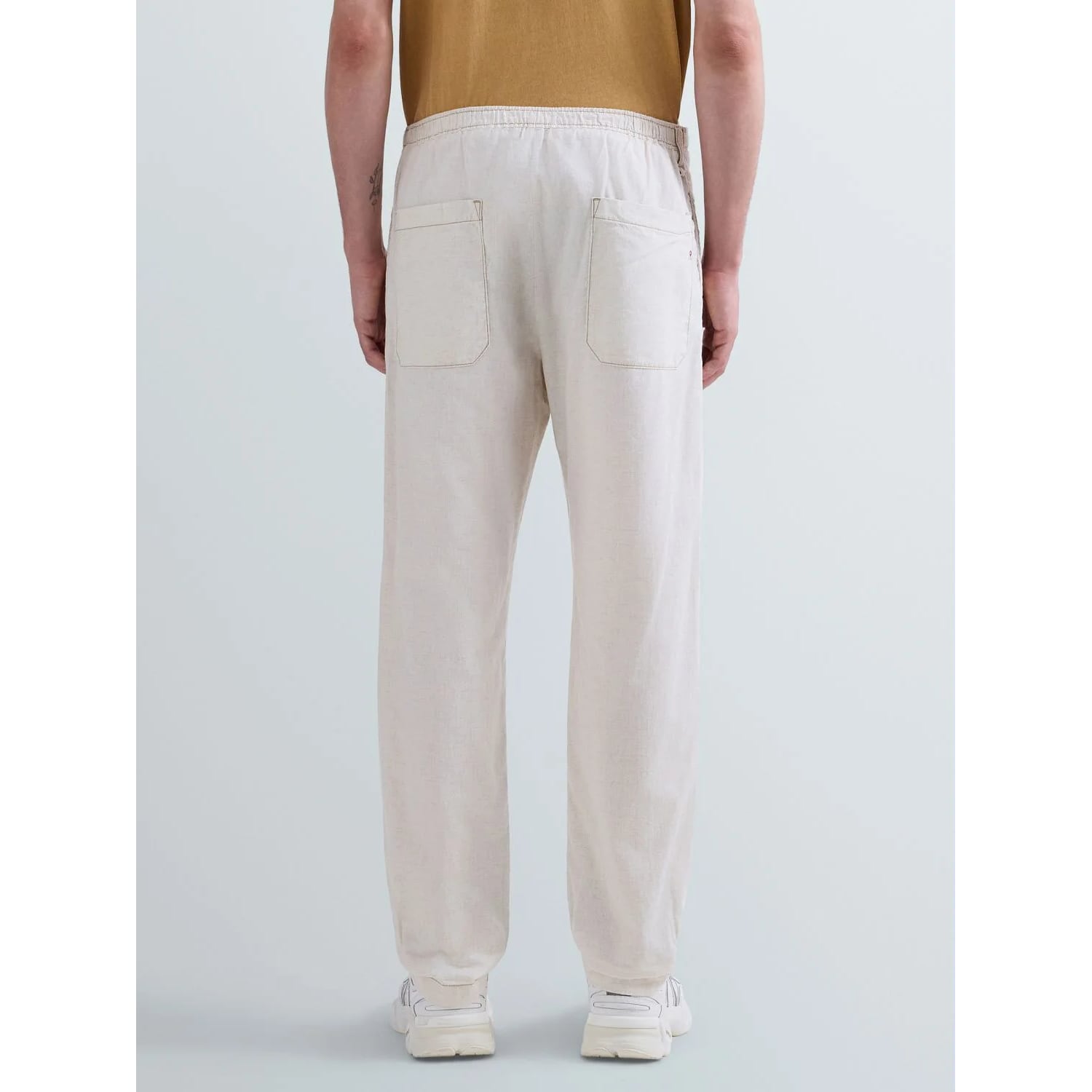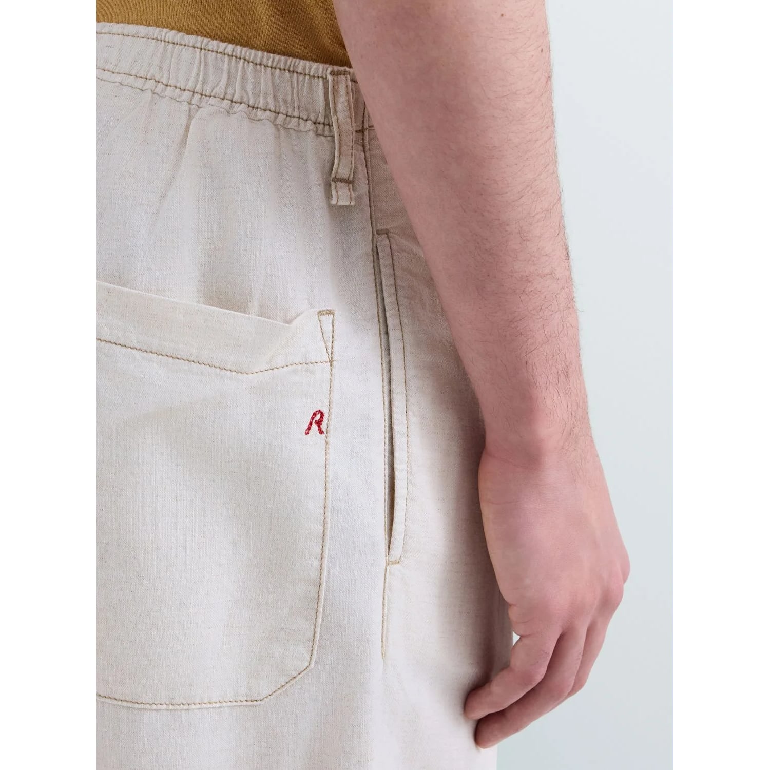 エクリュカラーのテーパードフィットのレギュラーライズパンツ。コットンとリネンをブレンドしたデニムに洗い加工を施し、最後にハングドライで仕上げることで、軽やかさと自然な風合いを兼ね備えています。ウエストはドローストリング付きの伸縮性ウエストバンド仕様で、快適な穿き心地を実現。サイドには2つのウェルトポケット、背面には2つのパッチポケットを配置し、うち1つにはブランドを象徴する「R」刺繍をあしらっています。フロントの洗練されたダーツが、すっきりとしたシルエットを演出します。